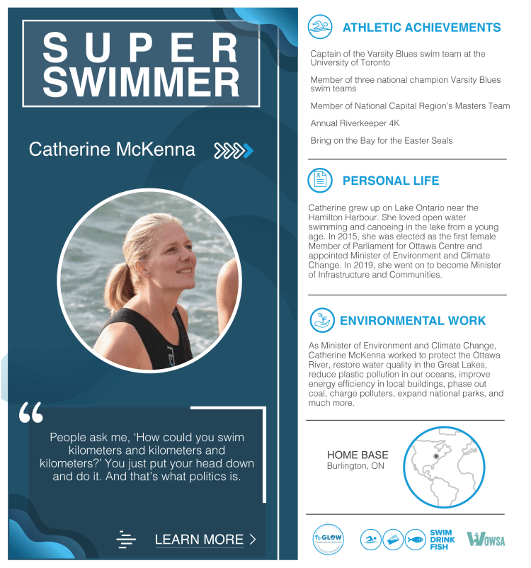 Catherine grew up on Lake Ontario near the Hamilton Harbour. She loved open water swimming and canoeing in the lake from a young age. When Catherine attended the University of Toronto, she was captain of the Varsity Blues Swim Team. Even once she got older and was no longer competing, she still enjoyed the thrill of open water swimming.